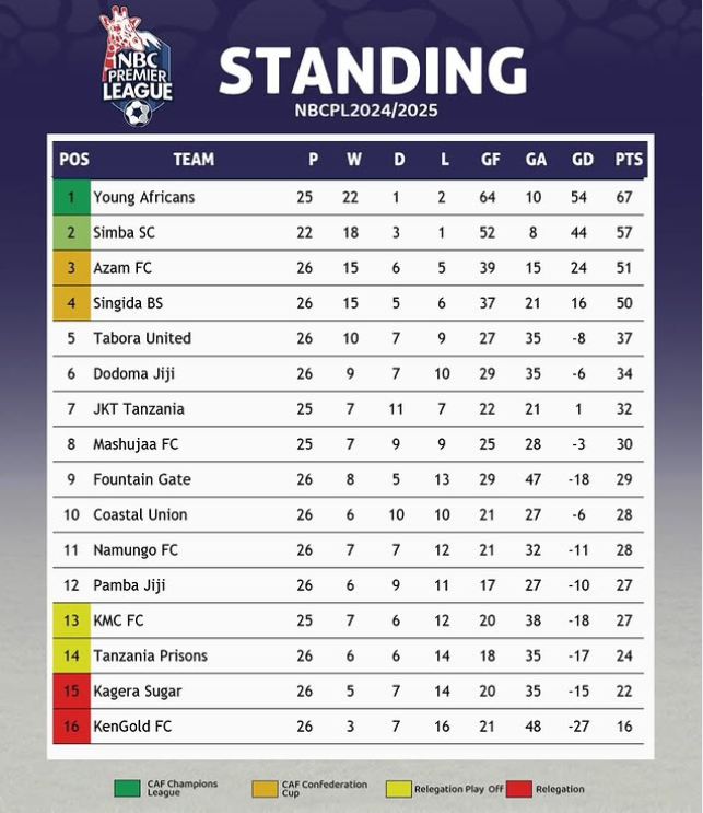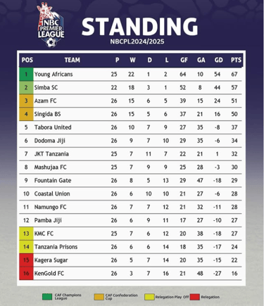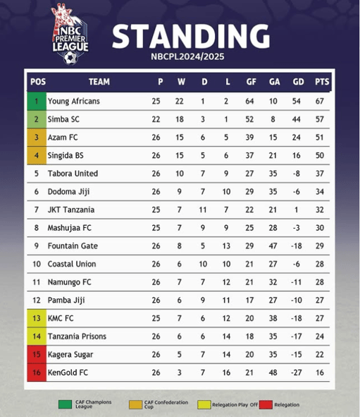 Msimamo wa Ligi Kuu Tanzania Bara (Aprili 10, 2025):